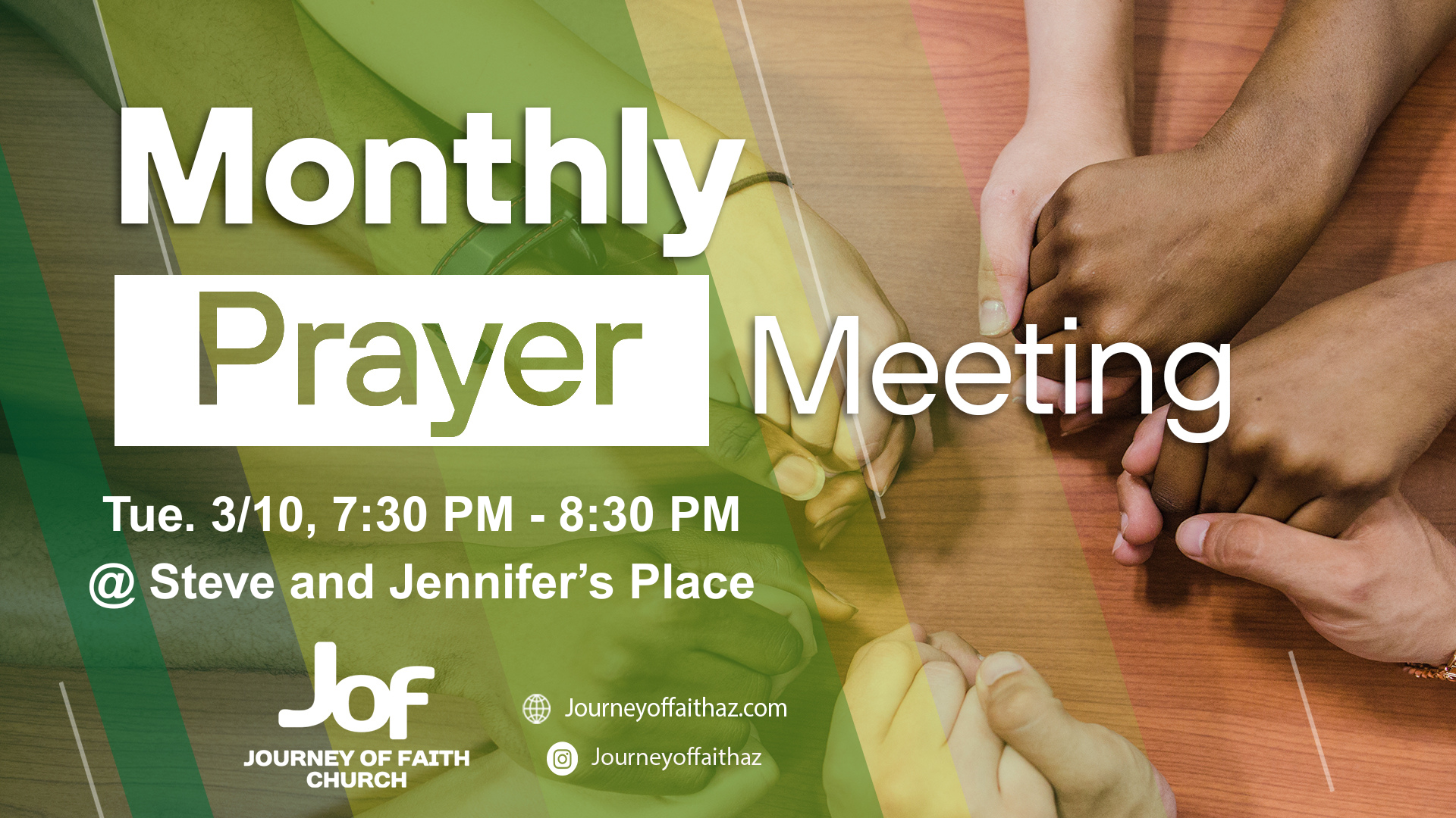 Tue. 3/10, 7:30 PM - 8:30 PM Please join us for corporate prayer at Steve and Jennifer’s place. We will be praying for the church, leaders, one another, and other […]